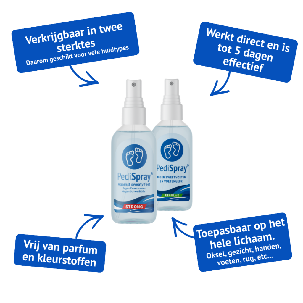 PediSpray® pakt het probleem aan waar het begint: bij het zweet zelf. Door de transpiratie te reguleren, elimineer je direct de belangrijkste oorzaak van zowel de geur als de broedplaats voor schimmels. Dit maakt PediSpray® tot een superieur middel tegen zweetvoeten.zelf. Door de transpiratie te reguleren, elimineer je direct de belangrijkste oorzaak van zowel de geur als de broedplaats voor schimmels. Dit maakt PediSpray® tot een superieur middel tegen zweetvoeten.