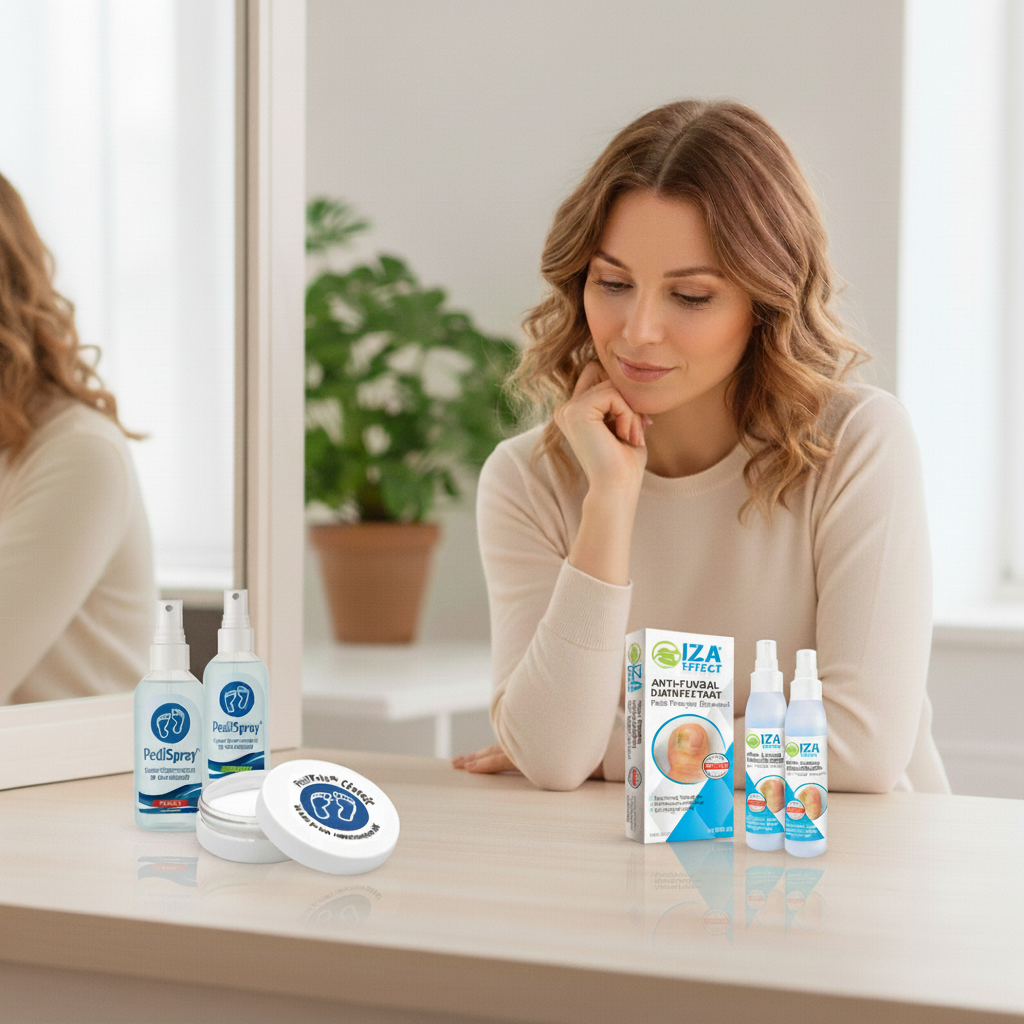 PediSpray® draagt op een fundamentele en unieke manier bij aan de preventie en verhelping van voetschimmel door de condities te elimineren die schimmelgroei bevorderen. Schimmels hebben vocht, warmte en duisternis nodig om te overleven en te gedijen. Door overmatige transpiratie te reguleren, zorgt PediSpray® voor blijvend droge voeten. Dit haalt direct twee belangrijke factoren voor schimmelgroei weg. De antiseptische eigenschappen van PediSpray® dankzij het extract van de kamferboom dragen hier ook krachtig aan bij, waardoor het niet alleen voorkomt, maar ook beginnende schimmelinfecties actief kan aanpakken. IZA Effect wat dit doet is de groei van een bestaande infectie afremmen en de symptomen te verminderen. Echter, zodra de kuur met IZA Effect is voltooid en de voeten blijven overmatig transpireren, is de kans groot dat de infectie op den duur terugkeert. PediSpray® biedt dus een proactieve, langetermijnoplossing door de omgeving ongeschikt te maken voor schimmel én de schimmel zelf aan te pakken, terwijl IZA Effect reactief werkt op een reeds aanwezige infectie zonder de hoofdoorzaak weg te nemen.
