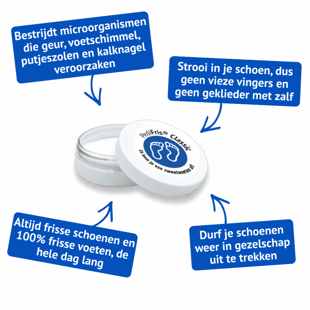 Door PediFris® Classic in je schoenen te strooien, creëer je een hygiënische omgeving die de groei van micro-organismen tegengaat. Dit zorgt niet alleen voor langdurig frisse voeten en schoenen, maar biedt ook een krachtige, continue bescherming tegen zweetvoeten, stinkvoeten, voetschimmel en kalknagel.